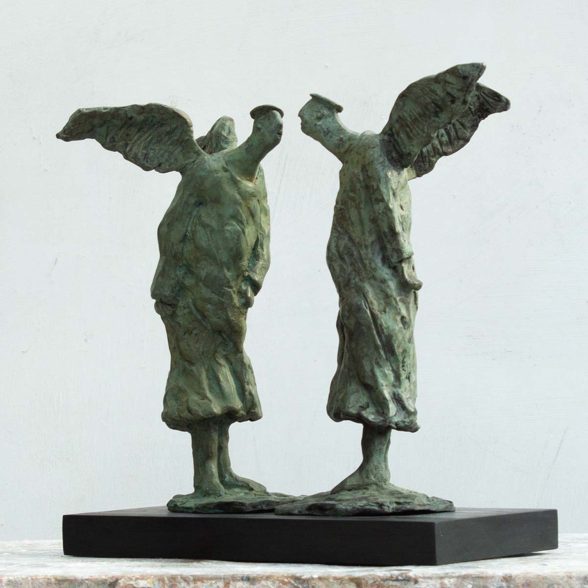 Focusing on posture, Vicki’s androgynous figures are captured at the edge of movement with a gentle reminiscent humour present in their body language.